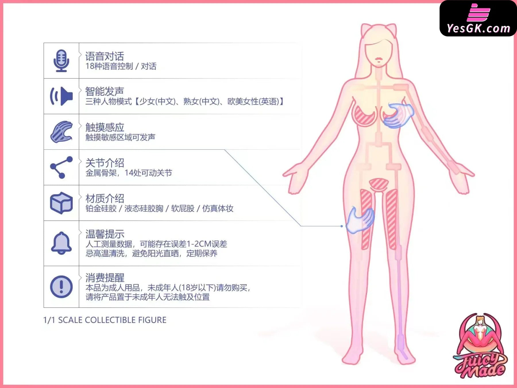 Voice Dialogue: 18 Voice Control/Dialogue Touch Sensing: Touch Sensitive Area Can Sound Intelligent Voice: Three Character Modes [Girl (Chinese), Mature Woman (Chinese), European and American Women (English)]